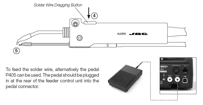 Forward the solder wire by pushing the dragging button (4) until the wire comes out of the tip (5).