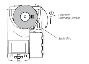 Insert the solder reel in such a way – when viewed from above – that the solder wire unwinds on the despensing mechanism side (4)