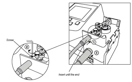 Connect the tool to the control unit following this steps: Insert and push the guide nozzle until the end (1) and tighten the screw (2). Then connect the tool connector (3).