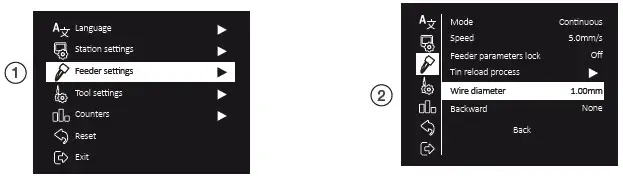 Acces to Main Menu by , select “Feeder Settings” (1) and then “Wire Diameter” (2) to adjust the value to the current solder wire diameter.