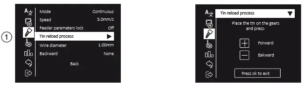 Select “Tin Reloaded Process” (1) and then use to feed the solder wire and advance until it comes out through the outlet nozzle. Keep pressed and after a while the wire will advance faster.