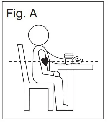 - Place your elbow on a table so that the cuff is at the same level as your heart as shown in Fig. A. Relax your entire body, especially between your elbow and fingers.