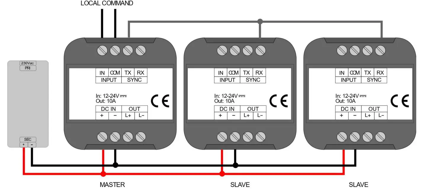 - Using one power supply every single dimmer, first power on the Master unit and after that give power to the Slave.