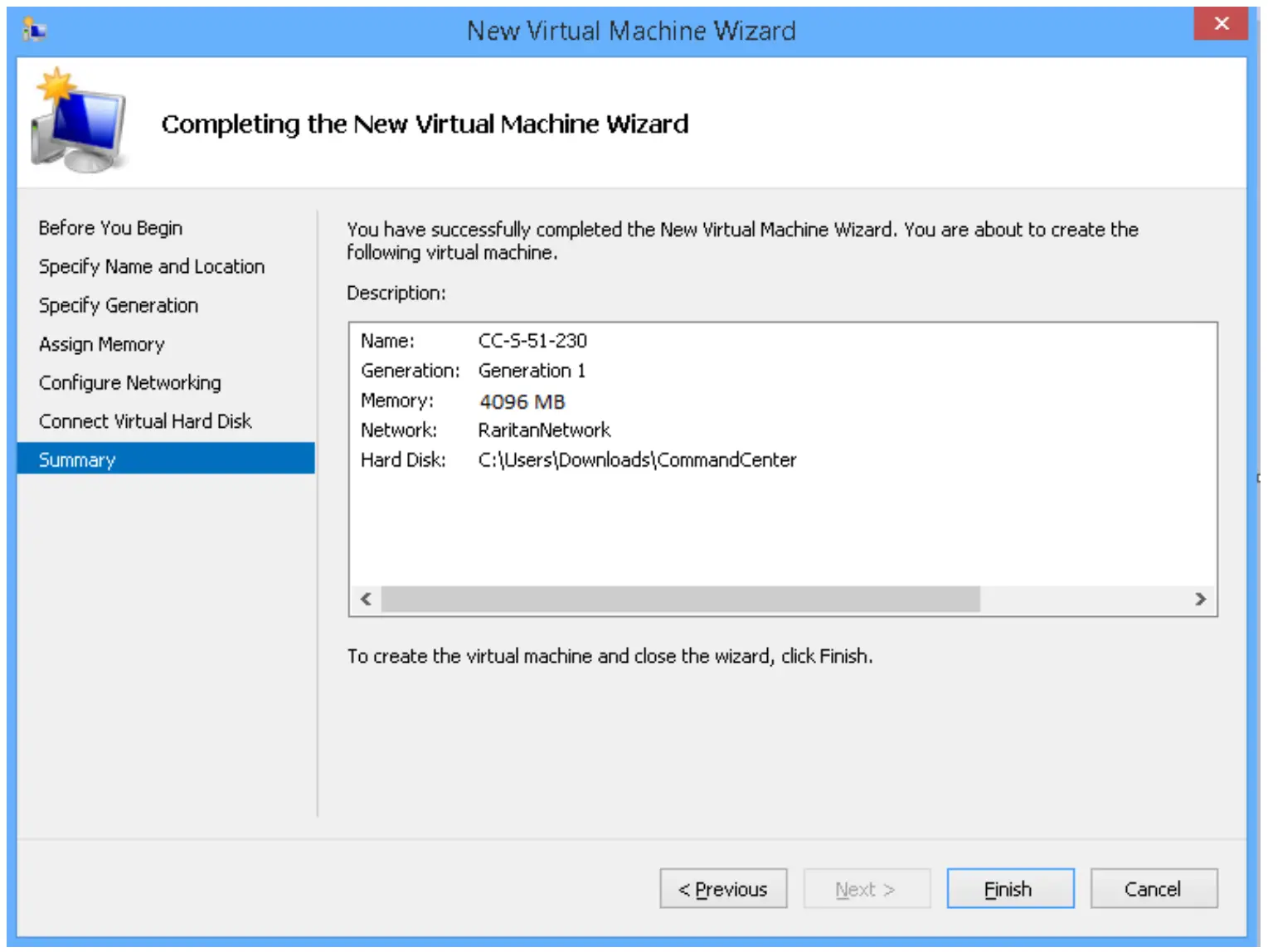 - A summary of the VM displays. Click Finish.