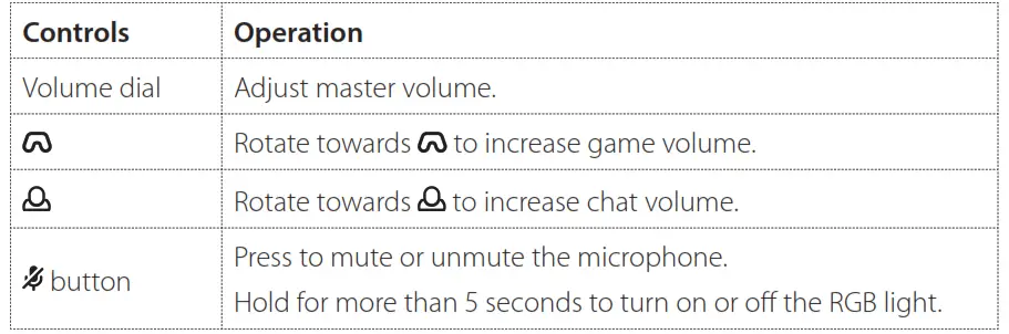 • Hold for more than 5 seconds to turn the RGB light on or off.