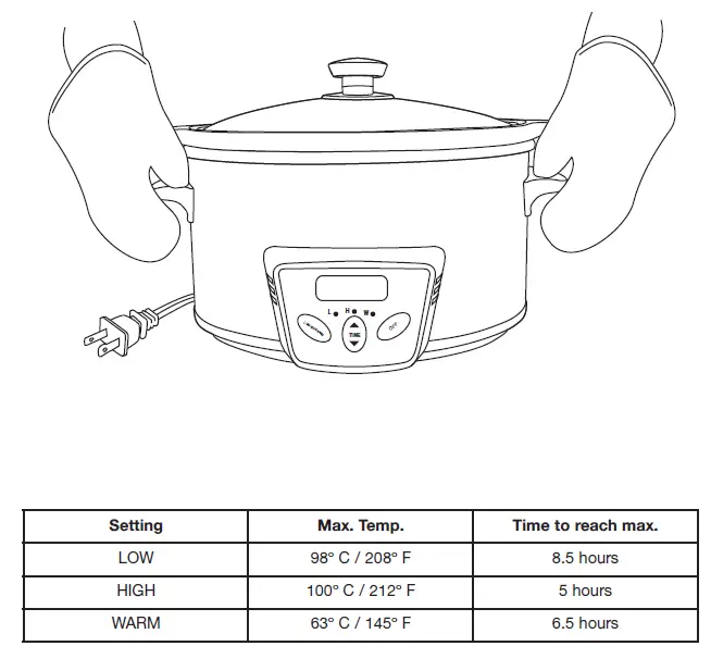 CAUTION: The base unit will get very warm during cooking. This is where the heating elements are located. Use pot holders or oven mitts when moving or handling the unit. - When cooking time is complete, the Programmable Slow Cooker will automatically switch OFF.