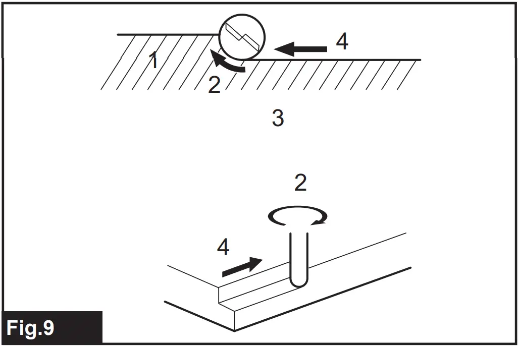 1. Feed direction 2. Bit revolving direction 3. Workpiece 4. Straight guide