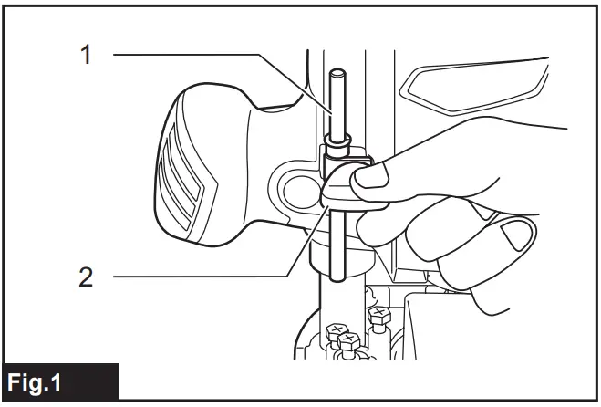 - Raise the stopper pole until the desired depth of cut is obtained. The depth of cut is indicated on the scale (1 mm per graduation) by the depth pointer. Then tighten the screw to secure the stopper pole.