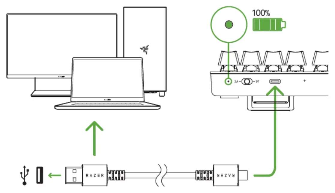 - Connect your keyboard to a powered USB port using the Type C to Type A cable to charge your keyboard. The power indicator will turn solid green when the keyboard is fully charged.