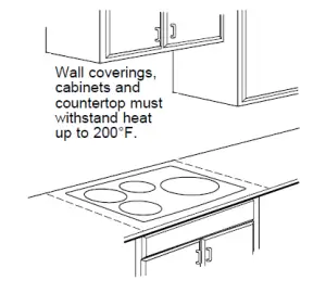 4 Make sure the wall coverings, countertop and cabinets around the cooktop can withstand heat (up to 200°F) generated by the cooktop.
