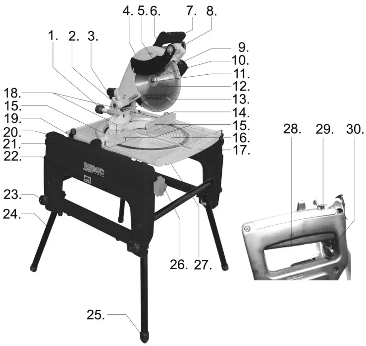 - Push the lock button on the handle (7) to the left. Press the safety trigger (29) and the on/off switch (28) on the handle and allow the saw to reach full speed before cutting the workpiece.