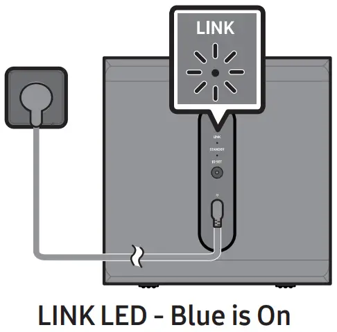 The LINK LED indicator stops blinking and glows a solid blue when a connection is established between the Soundbar and the Subwoofer.