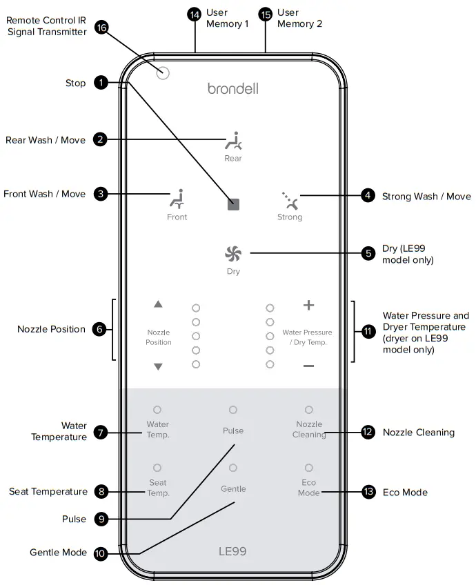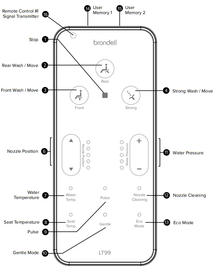 | Wash features do not work or fail to spray | 1. Not activating Seat Sensor 2. Pressing or touching the remote too rapidly | 1a. Adjust the sitting position to fully cover the Seat Sensor. 1b. Override the Seat Sensor (see page 18). 2. Lightly place your finger on the desired setting until the seat chimes, signaling activation. |