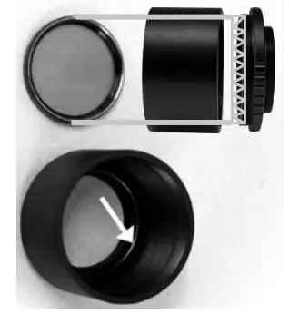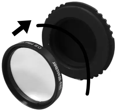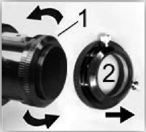 In order to easily unscrew the ring, hold with one hand the ring (1) at the end of the drawtube and then unscrew the 2″ ring adaptor (2) with the other hand.