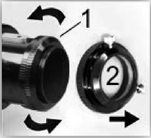 - Loosen the two thumbscrews (1) on the end of the focuser tube.