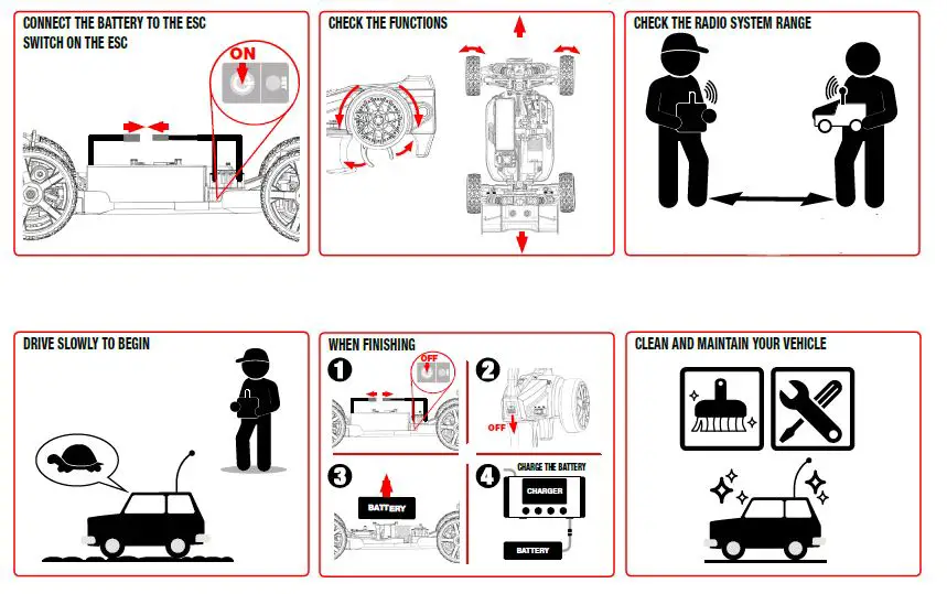 - Please drive your car in a spacious place. Never drive your car on the street or in traffic. Public places are subject to specific legisla-tion by country, city, municipality, please comply with the legislation for the use of RC models in your region.