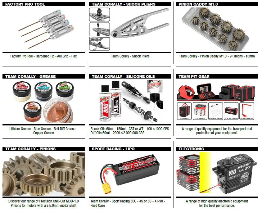 Thank you for purchasing a Team Corally car. This manual describes the instructions for using the model and the electronic compo-nents. You will also find some tips on how to maintain your RC model so that you can enjoy it for years to come. You have purchased one of the most efficient models available on the market that has been designed by a team of professionals. You will also benefit from the best after-sales support. All Team Corally models guarantee a high quality of manufacture and performance that guarantees you a high satisfaction of use and services provided by the Team Corally. Always take the time to read the instructions carefully in order to follow all the procedures to use your RC model safely for you and for other people and property in the area. This will allow you to take full advantage of all the performance of your RC model. Please also check the website www. corally.com/Downloads/ to check if you have the latest version of this instruction manual. (Version: see bottom cover of this manual)