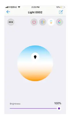 - RGB+CCT Device Control Interface, RGB and CCT colors are controlled separately, default interface is RGB interface as shown in Figure 13, for control operations please refer to RGBW Device Control Interface as shown in Figure 12. Tap “” at the upper right can go to the CCT control interface, for control operations please refer to CCT Device Control Interface as shown in Figure 11.