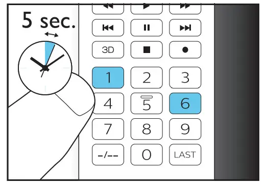 List of IR codes for Panasonic and Philips TVsPanasonic TV Panasonic TV Philips TV 0 14 108 1 15 109 2 16 0 0110 3 17 0 0111 4 Philips TV 0 0112 5 100 0 0113 6 101 0 0114 7 102 0 0115 8 103 0 0116 9 104 0 0117 10 105 0 0118 11 106 0 0119 12 107 0 0120 13 - Enter the selected 5-digit code using the digit buttons.