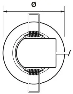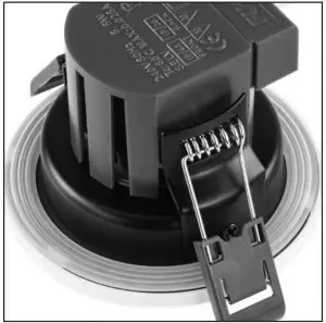- Push the downlight into the cut-out in the ceiling by folding the two spring arms back, the spring arms keep the downlight in place. Make sure that there are no trapped cables or insulation between the ceiling and trim of the fitting.