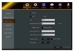 Enter “Preview Configuration” interface (main menu– display management– preview configuration), the user can do the operation of alarm screen switch delay, turning on/off audio preview, choosing preview display mode, choosing screen split mode, etc. Alarm screen switch delay can be set 1~10 seconds. When the alarm triggered “pop-up screen”, the preview interface will pop up the associated channel screen. Preview display mode can select stretching mode, smart mode and isometric mode. It is default smart mode, this feature is mainly used to solve IPC display problems in corridor.