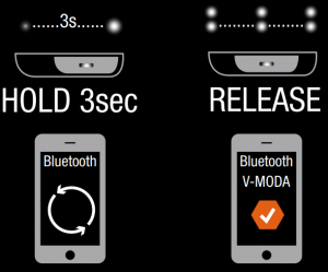 2. PAIRING (NEW DEVICES)![]() | Once powered on, slide switch to the right, hold 3 seconds, when the LED starts to blink twice per second, release the switch. The switch will return to the middle position and begin to search. Once “V-MODA Crossfade 2” appears in the “new Bluetooth devices” section on your phone, select it to begin pairing |