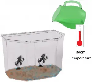 Fill the aquarium with water to within one inch from the top of the tank. Treat water with a de-chlorinator to remove chlorine and chloramines from tap water that can be harmful to your fish. Confirm water temperature in aquarium has reached room temperature.