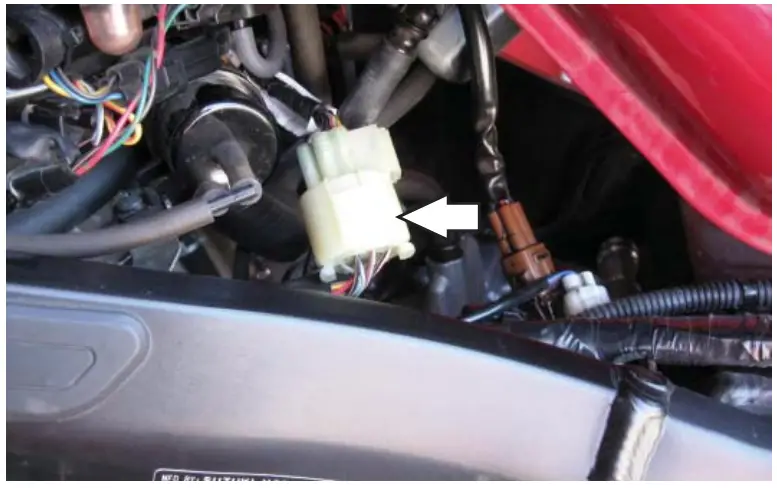 - Locate the connector from the main wiring harness to the injector rail and unplug this connector as shown.