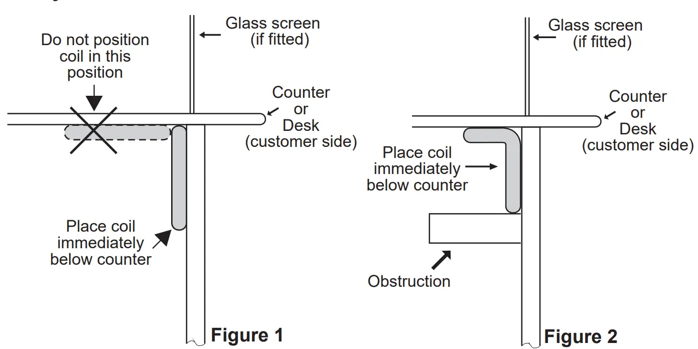 ● Unfold the loop coil. Fit to the counter ideally approximately 250mm behind the front edge of the desk. The top of the coil should be between 900mm and 1000mm above the finished floor level to provide compliant signal to both seated and standing height users. The coil must be installed either vertically or with up to 50% of the coil folded away from the customer side.