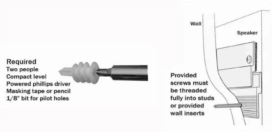 Locate the desired height for the top of the speaker with the lower edge of a piece of masking tape on the wall. Now measure downward 1.75 inches. This is the height that the additionally provided bracket will need to have the two mounting screws installed.