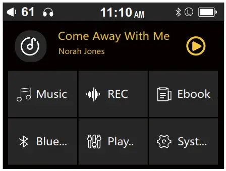 At the main interface, it has 6 sections: Music, Record, Reading, Bluetooth, Setting, and System Setting. Just simply touch the function to enter the respective settings. Touch and hold the MUSIC section, it can scan all music files on the device.