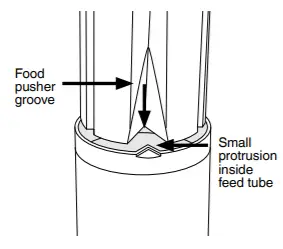 - Slide the food pusher down the food chute by aligning the groove in the food pusher, with the small protrusion on the inside of the top of the feed tube.