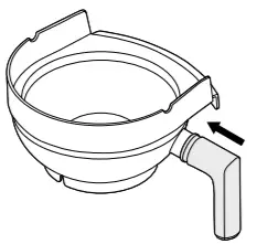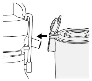 - Place the pulp container into position by tilting and lifting the motor base slightly. Insert the pulp container under the juicer cover on the back ensuring the front edge is tucked under the back lip of the filter bowl surround and the bottom edge is clipped into the bottom of the motor base.
