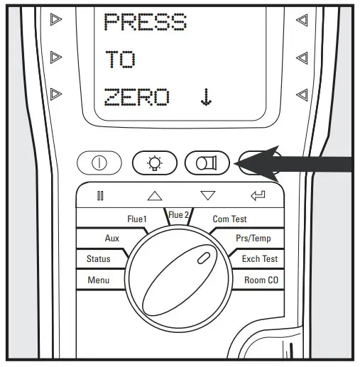 Rotate selector dial to Flue 2. In fresh air, the CO reading should be zero (0).