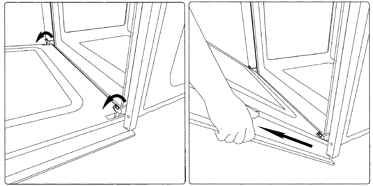 To replace fit the door, fit the hinges in their mountings and lower the two levers.