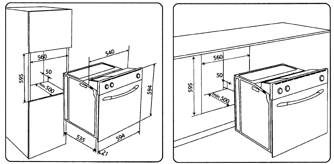 The oven can be installed under a work top or in a cooking column. Figure shows the installation dimensions. Make sure that surrounding materials are heat resistant. Align the oven centrally with respect to the side walls of the units surrounding it and fix it in place with the screws and Allen screws provided.