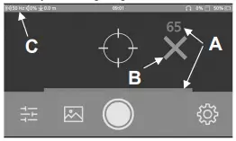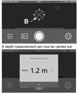 When you have arrived at the location with the greatest signal strength (forward/ backward/ left/ right), the transmitter position (B) is in the center of the screen.