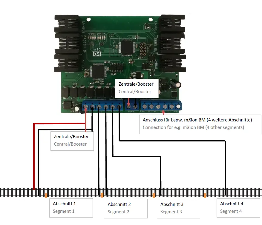 The mXion RBM is a universal, analog, and digital (any format/system) usable occupancy detector for the detection of electricity consumers within a section. The module supports 4 sections and can these ads or as switch contact feedback. Is loaded consumer within a segment, switches the contact number and is displayed on the RBM itself with the integrated LEDs. For the free 4 contacts, another BM module from us can be used for this connection so that in total 8 sections can be monitored. The configuration is done via CV programming. Ideal for displaying track plans with a display of currently occupied track sections, PC control, and much more. For feedback to the center is a corresponding feedback module not requ. For S88 and XpressNet there is also a feedback build in which the feedback is easily possible. The module can by CV-Programming with div. modes are set. Underneath it is also possible to configure the signaling outputs (K1-K4) as input (for external occupancy detectors as BM or switch contacts). In addition, automated processes can also be used be configured like switching turnouts, also depending on the direction depending on the configuration. The current detection limit can be set via CV in very small sets. The double flash of the middle two LEDs will show the correct working wireless module.