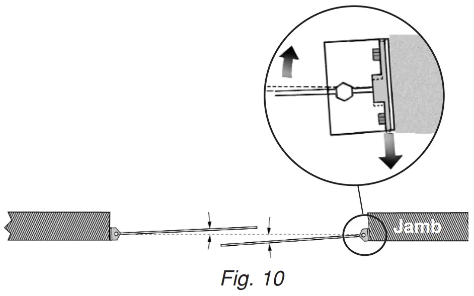 Loosen (DO NOT REMOVE) the 2 adjusting nuts. By moving the adjustment plate to one side or the other, it will force the panel to move in the opposite direction. (See Fig. 9) i.e. Move the plate to the right…the panel will go left. (See Fig. 10)
