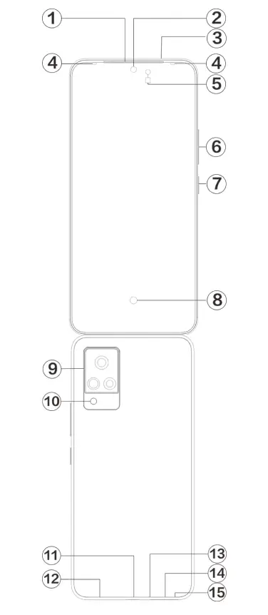Note When the phone can not be used normally, simultaneously long press [Power button] and [Volume button-] more than 1 O seconds to force the device to restart . - ⑭ SIM card tray: Install/Remove the cards.