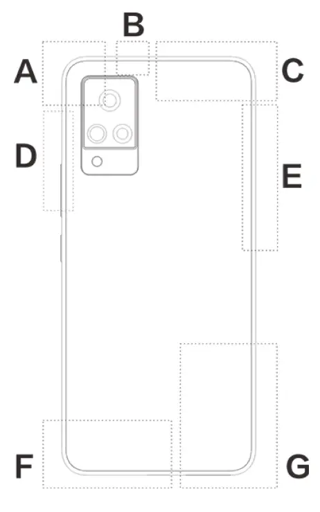This phone is equipped with a built-in antenna. Please do not touch the antenna when it is transmitting or receiving signals. Touching the antenna may affect communication quality, cause the phone to operate using a power level higher than needed as well as shorten the battery life. The antenna is located inside the circle marked with dotted lines. Please do not cover this area when holding the phone, as shown in the picture below: A. GPS/Wi-Fi/Bluetooth antenna; B/D/E. SG antenna; C. Upper main antenna; FIG.Lower main antenna.