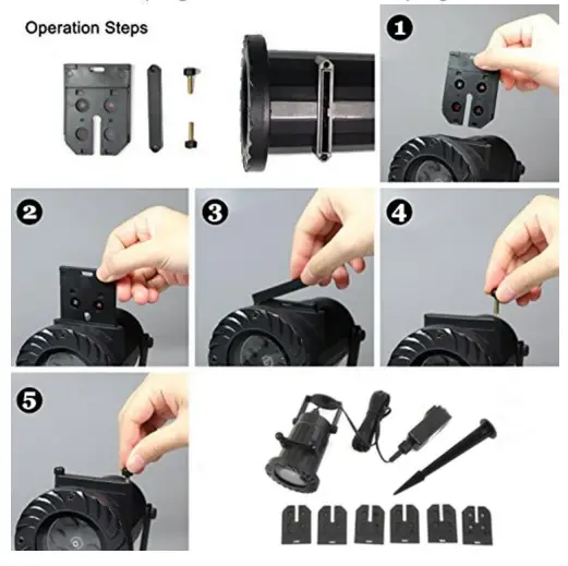 First remove the screw on the ground stakes and put them into the corresponding screw holes of the lamp. Then fix the screw with your fingers, and screw the ground stake or lampstand clockwise(to remove it, loosen it counterclockwise). - You can change the projection angle of the lamp by 180° up and down.