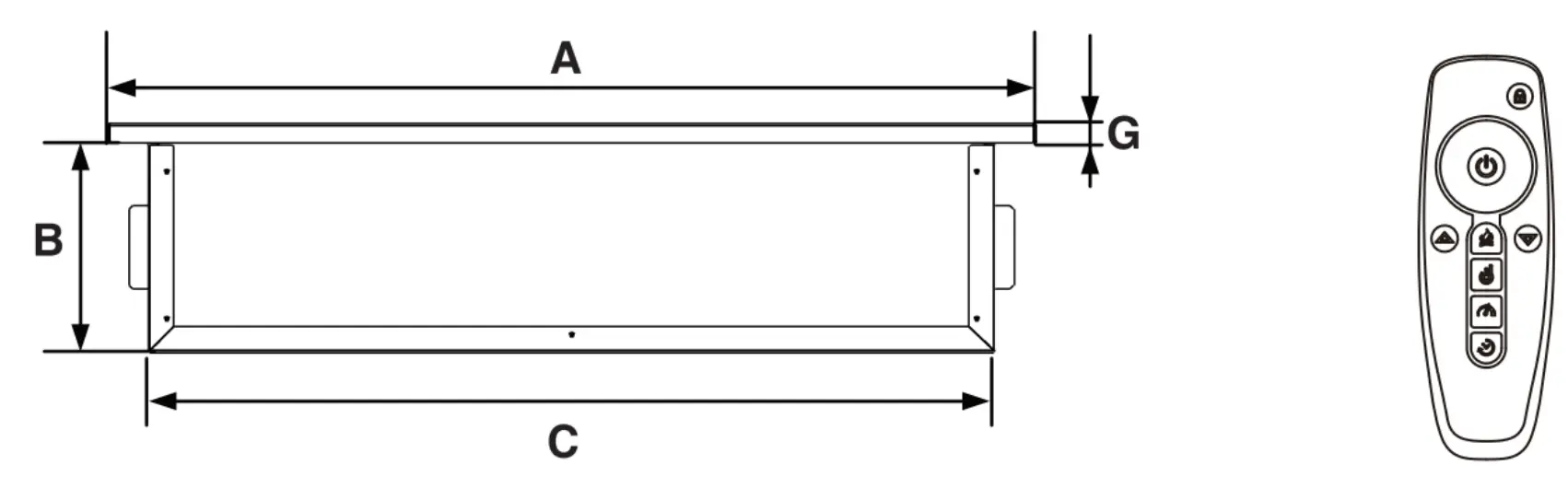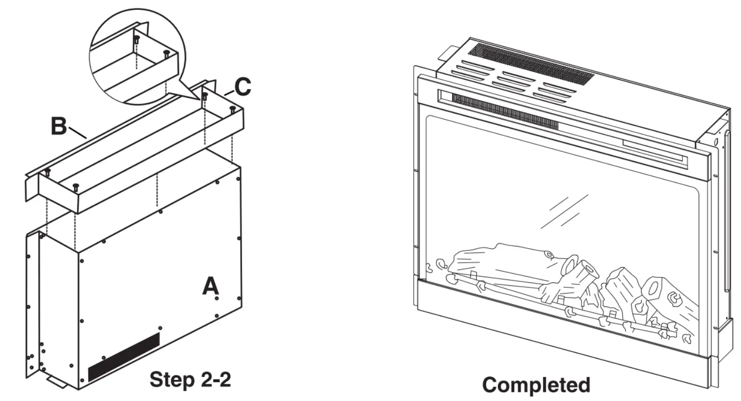Fasten the trim (C) to the trim (B) with 4 screws. Align and attach the assembled metal base (B & C) to the bottom of the fireplace insert (A) with 5 screws. - Recessing into a wall Prepare the opening and outlet. Place the unit into the framed opening gently and no fixing brackets are needed.