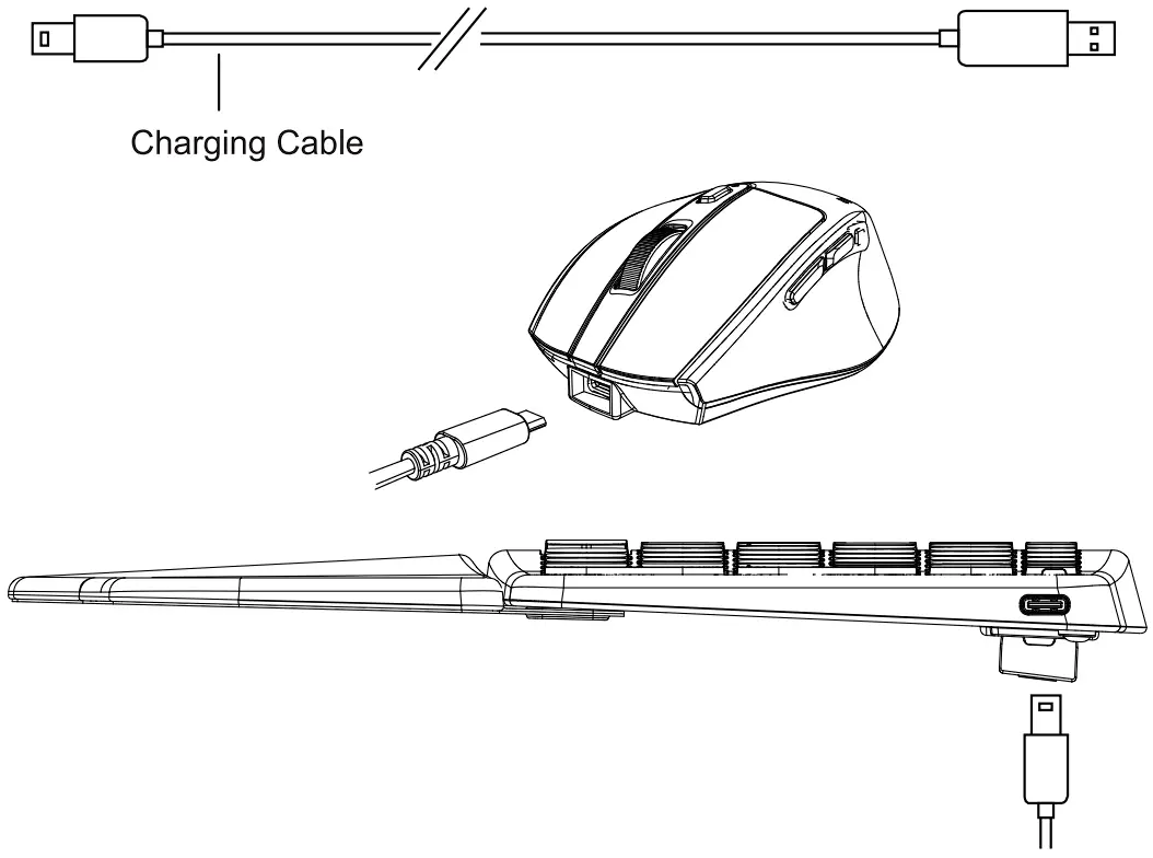 Charging Tips: The indicator light is r•ed when the keyboard is charging, and blue when fully charged. The ·indicator Ught ls red when the mouse is charging, and blue when fully charged. (Charge with 5V-1A computer interface).