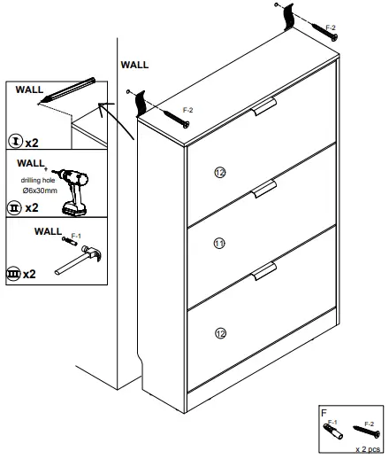 Option Ⅱ Please use the pen to locate the anti-toppling position on the wall, use the impact rotation guide hole position, then use the hammer to hit (F-1) the wall, use the screw (F-2) to pass through the cloth to lock with the wall!