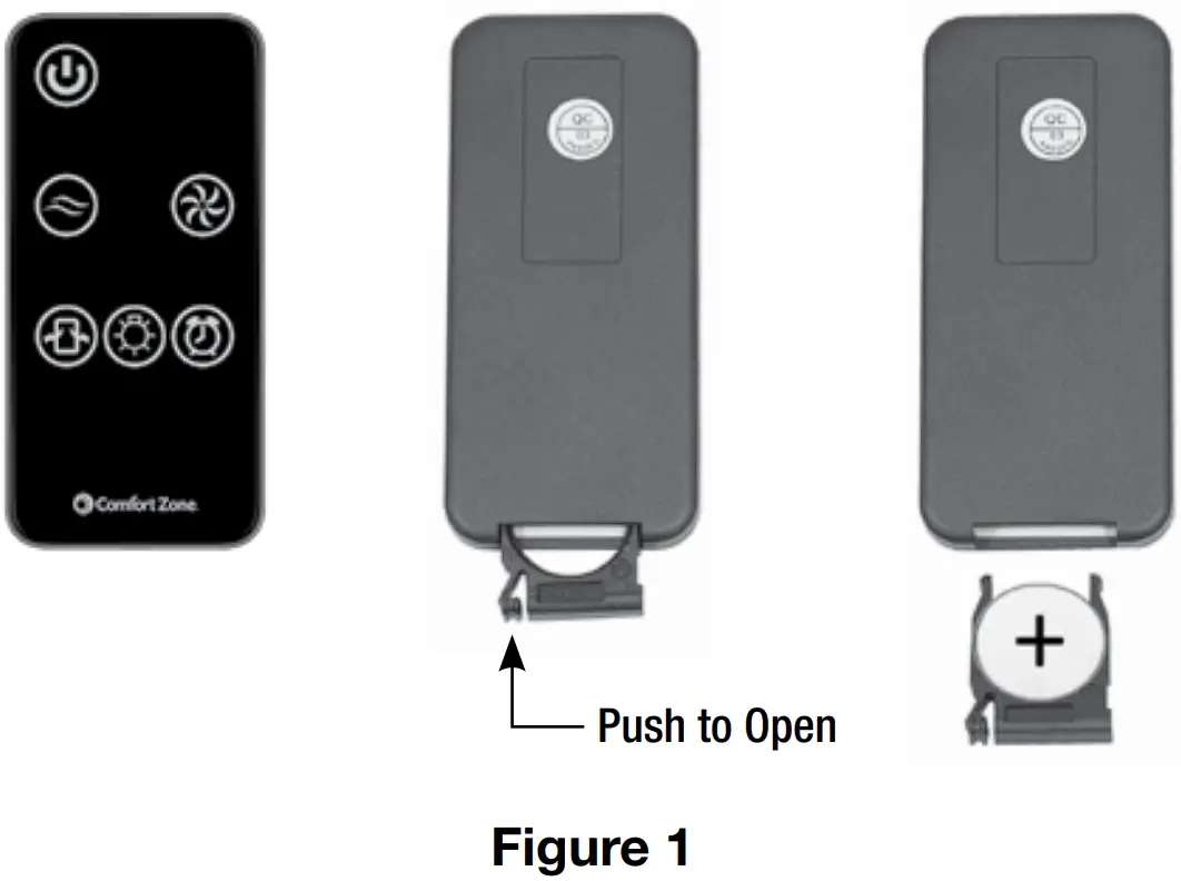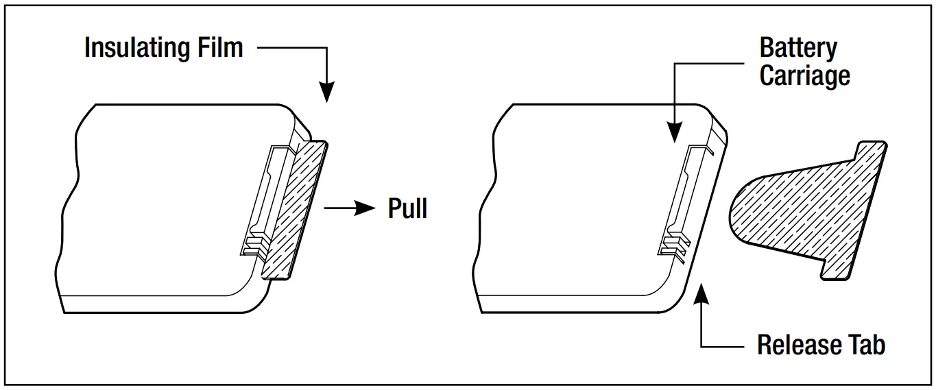 To remove the battery carriage use your thumb to squeeze the release tab to the right and then pull the carriage out. Place the battery into the carriage and slide the carriage back into the remote. (see Fig.1). We recommend the use of a Lithium Ion battery for longer use.