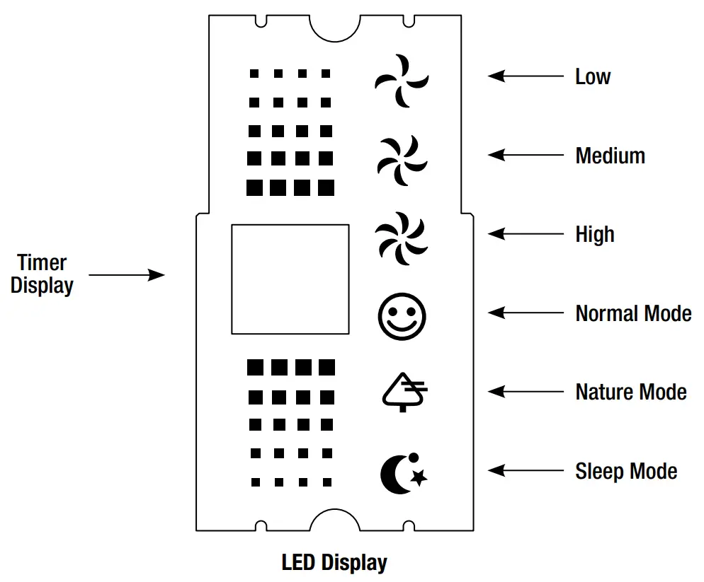 ![]() | NATURE MODE – Designed to replicate natural air, the fan will vary the wind speed among OFF/LOW/MED/HIGH settings and repeat every 40 seconds per cycle.