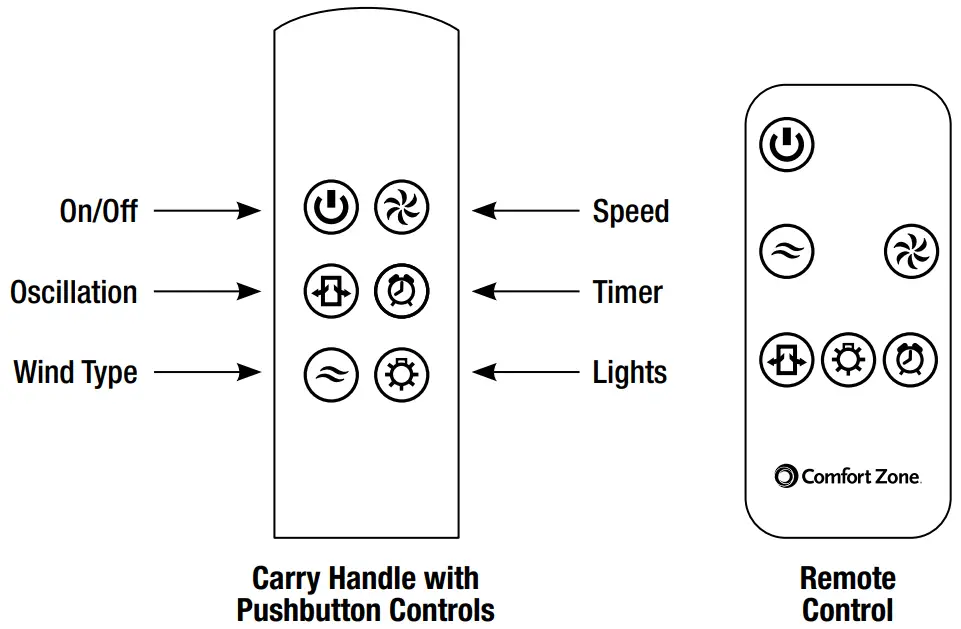 - All functions performed with remote control work identically to the fan control panel.