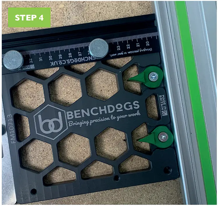 - Attach your rail square to your rail and secure using the cam screws. Align your fence to the edge of the rail and tighten the thumbscrews.