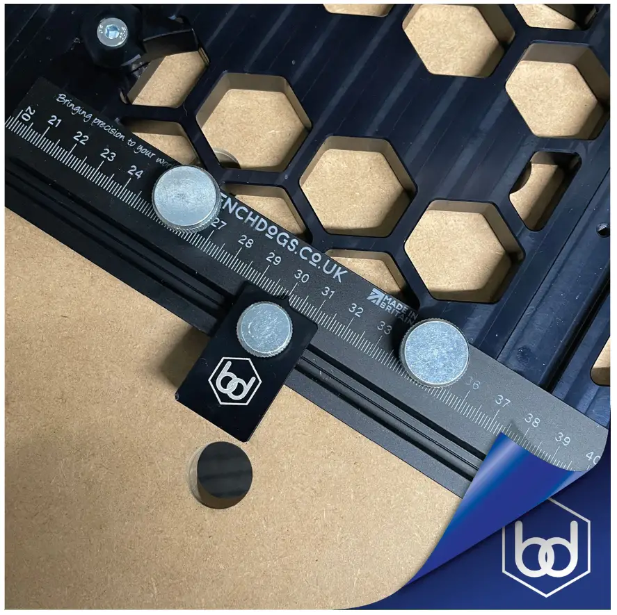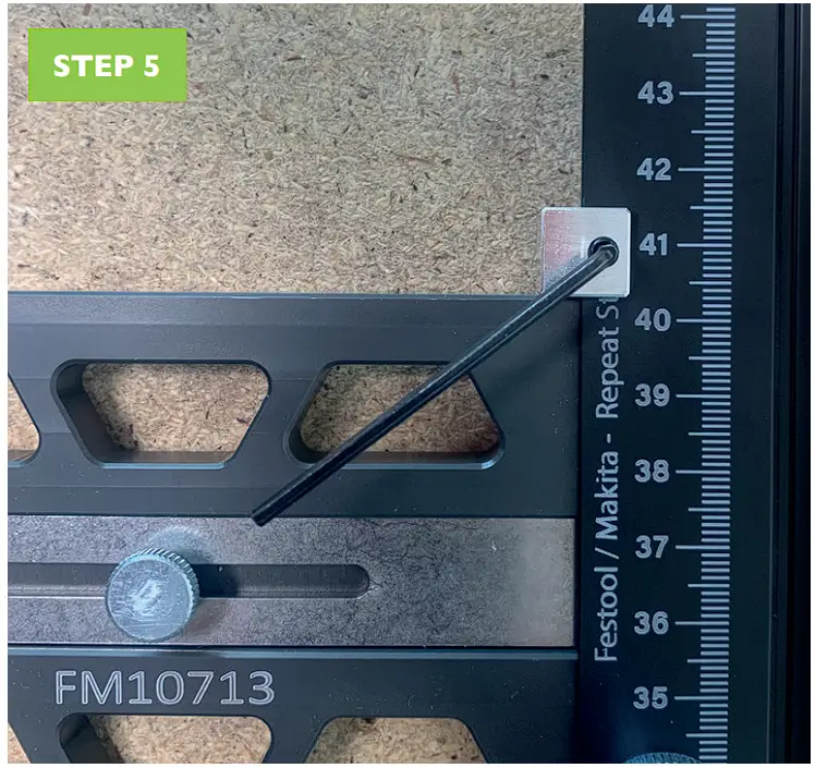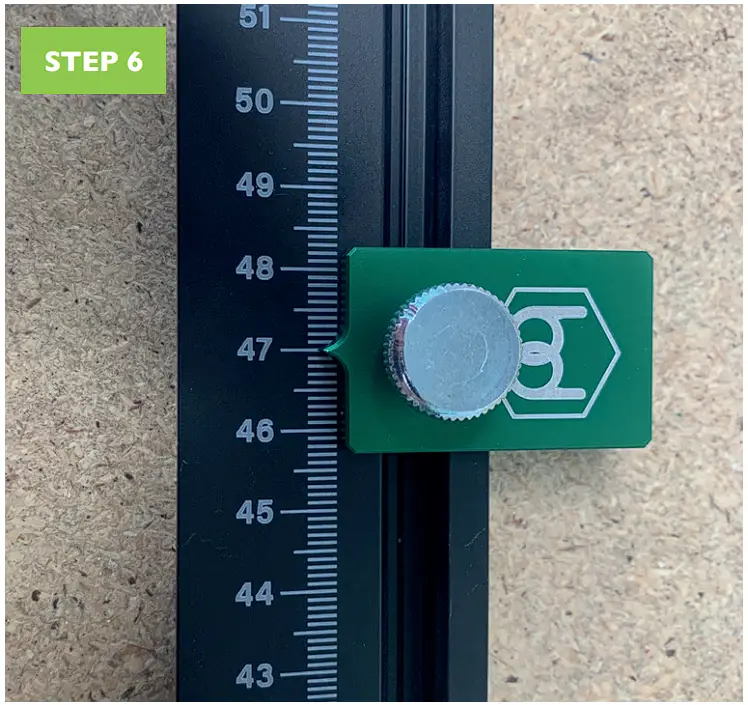 - Place the aluminium stop to the desire measurement, place against the edge of your material and proceed to cut.